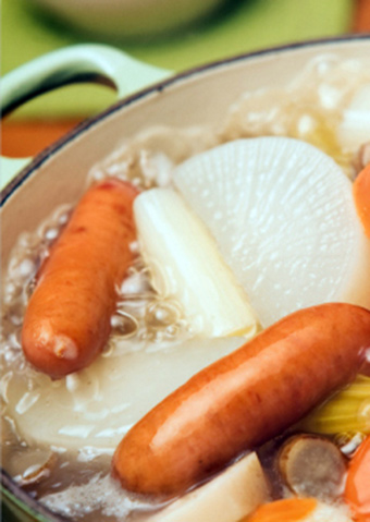 用香肠代替猪肉和牛肉比较简单和健康。开始先品尝汤汁,接着品尝用荠菜粒和柚子胡椒佐味的美味香肠和蔬菜。